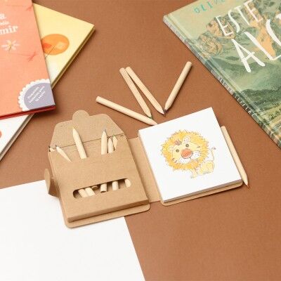 Kit escolar ecológico fabricado en papel kraft. Incluye 40 hojas de papel y 12 lápices de colores. Medidas: 10.7x9.5 cm.