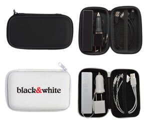 Kit de accesorios para viaje. Cuenta con batería portátil de 2200 mAh, cargador para automóvil, cargador de pared, cable adaptador 3 en 1 USB, 30 pin, 8 pin y micro USB. Presentación: estuche blanco o negro con cierre.