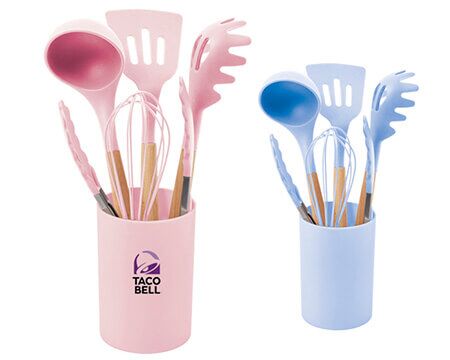 Kit de cocina con utensilios de silicón y mango de madera que contiene: 1 batidor de acero inoxidable, 1 volteador, pinzas de cocina, 1 cucharon y 1 cuchara para pastas. Incluye base de plástico para guardar. Presentación: caja en color blanco. Medidas: 10 x 10 x 30 cm