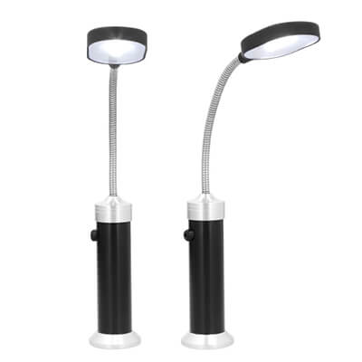 Lámpara portátil metálica con luz LED que enciende con 3 baterías AAA (no incluidas), botón de encendido de click, soporte flexible e imán en la parte inferior. Medidas: 29 alto x 4 ancho