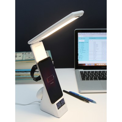 Lámpara LED de escritorio con cargador Inalámbrico. Fabricado en plástico ABS cuenta con 3 modos de iluminación, aumento o disminución de brillo, reloj, despertador y estación de carga inalámbrica para teléfonos móviles o audifonos compatibles con tecnología Qi. Simplemente coloque el teléfono en la plataforma de carga inalámbrica de la lámpara de escritorio y el teléfono se cargará automáticamente.Esta lampara es ideal para alumbrar tu hogar u oficina y cargar tu dispositivo al mismo tiempo.Incluye caja individual. Medidas: 27.7x10.6 cm.