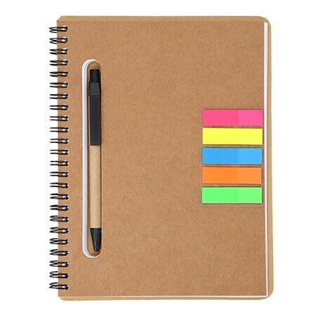 Libreta ecológica con 5 tiras de banderas adheribles y bolígrafo, cuenta con 80 hojas rayadas. Medidas: 21.2 alto x 17.5 ancho