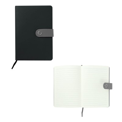 Libreta de poliuretano con 136 hojas de raya, separador y broche magnético. Medidas: 21 alto x 14.5 ancho