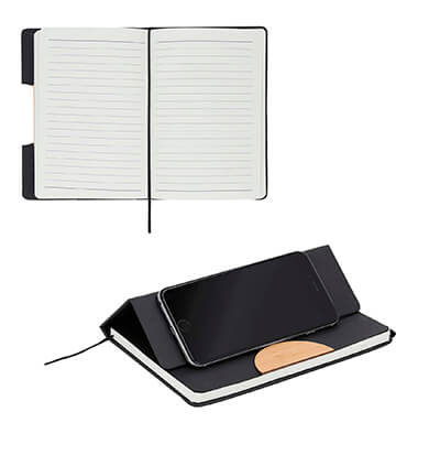 Libreta de poliuretano con hojas de raya y bambú que sirve cómo soporte para celular. Medidas: 21 alto x 14.5 ancho