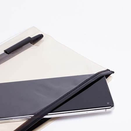 Libreta con funda transparente de plástico para guardar notas y su teléfono celular. Cuenta con 80 hojas rayadas e incluye bolígrafo metálico. Incluye un Grabado Láser GRATIS en el bolígrafo.