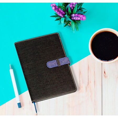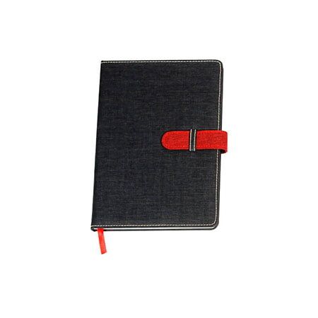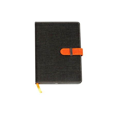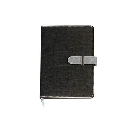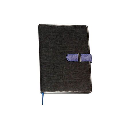 Libreta fabricada en poliuretano con broche y listón separador de hojas en color, con 80 hojas de raya. Tamaño A5. Medidas: 21x14.8 cm.