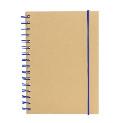 21 x 14,7 cm. Cartón y Papel. Libreta espiralada. Tapa recubierta en papel kraft de 120 g. Interior de 70 hojas blancas rayadas de 80 g. Cierre con banda elástica y espiral del mismo color.