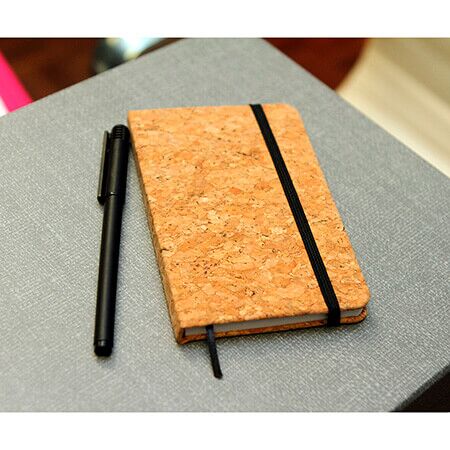 Libreta con pasta de corcho, listón separador de hojas, 80 hojas rayadas de 70 g y banda elástica negra sujetadora de pastas. Medidas: 14x9 cm.