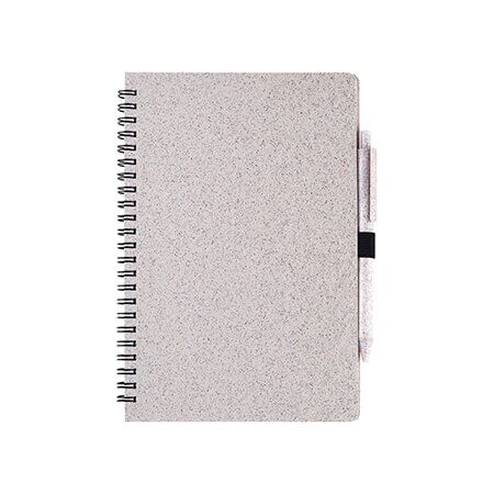 Libreta ecológica con pasta de fibra de trigo y plástico ABS, 60 hojas de papel de piedra y bolígrafo fabricado en el mismo material ecológico con tinta de escritura negra. Tamaño A6. Medidas: 14.8x10.5 cm.