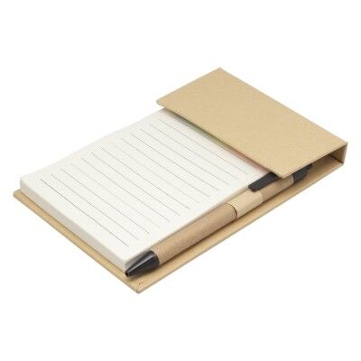15,5 x 10,5 cm. (cerrado) y 15,5 x 22,3 cm (abierto). Cartón kraft de gran firmeza. Libreta anotador múltiples funciones. El kit contiene: un bloc de 70 hojas rayadas en obra ahuesado de 70g de 9 x 15 cm. impresos con fecha y día de la semana, bolígrafo retráctil tinta negra con cuerpo de cartón, pulsador, clip y puntera en plástico color negro, y 5 blocs de 25 tiras plásticas autoadhesivas de 4,4 x 1,2 cm en colores azul, verde, amarillo, naranja y rosa.