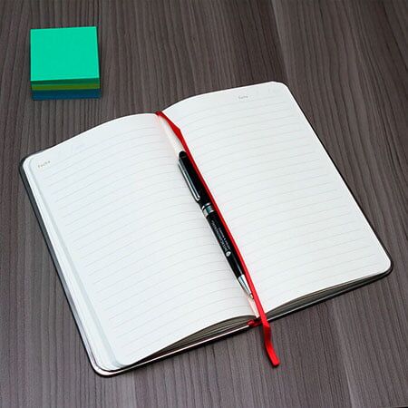 Libreta con 98 hojas de raya, listón separador de hojas, manga de cartón individual y resorte sujetador en pastas. Medidas: 21x13 cm.