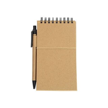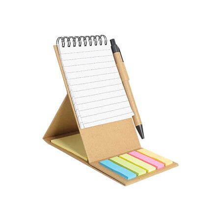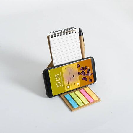 Libreta con pasta de cartón, banderines, notas adheribles y bolígrafo con tinta de escritura negra. Sirve como soporte de celular.