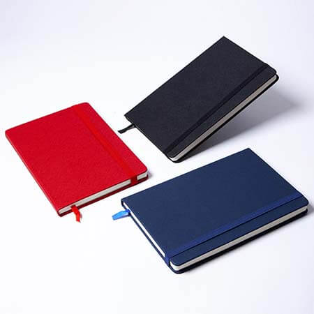 Libreta con cubierta dura de PU texturizado, banda elástica, separador y 80 hojas rayadas. Recomendamos grabar en láser para que su logo destape a color.
