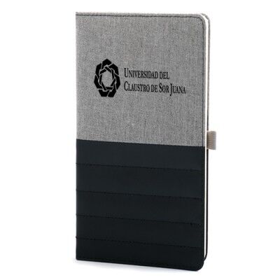 Libreta vertical A5 de pasta rígida con cubierta tipo curpiel. De 80 hojas rayadas (160 paginas). Separador de listón y porta bolígrafo elástico. Medidas: 14.3 x 21.2 x 1.4 cm