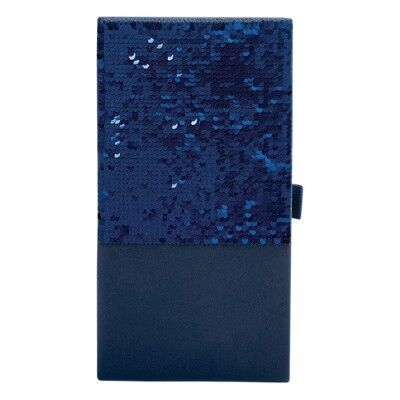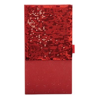 Libreta vertical A5 de pasta rígida con textura brillante y detalle lentejuela reversible. De 80 hojas rayadas (160 paginas). Separador de listón y porta bolígrafo elástico. Medidas: 14.3 x 21.5 x 1.5 cm