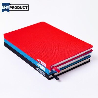 Libreta ecológica de pasta dura de Pet Reciclado, banda elástica y separador con 80 hojas rayadas.