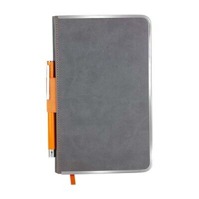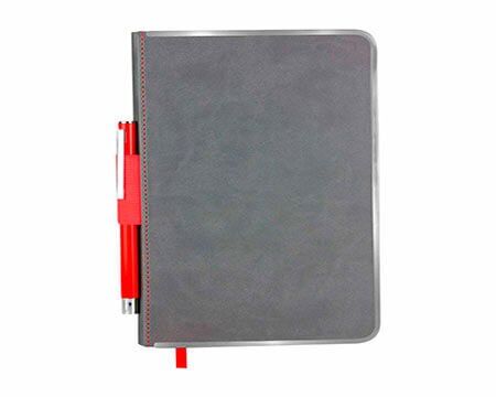 Libreta con 96 hojas de raya con borde metálico para protección de extremos. Incluye elástico y bolígrafo metálico. Medidas: 12.7 x 21 cm