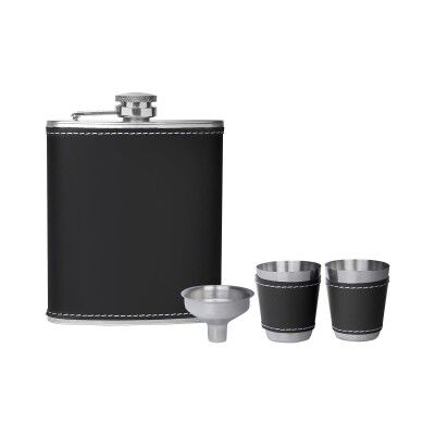 Set de licorera con tapa de rosca para evitar derrames, 2 vasos metálicos con manga de curpiel, 1 embudo y caja de regalo. Medidas: 10 x 12.5 cm Licorera / 3.6 x 4 cm Vasos