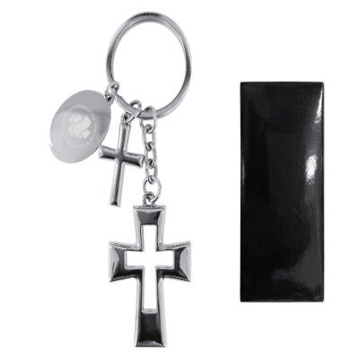 Llavero con 2 cruces y placa de aleación de zinc y arillo reforzado. Presentación: Caja individual en color negro. Medidas: 11 x 3.5 x 0.3 cm