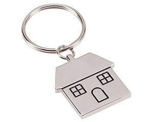 Llavero metálico con forma de casa, con arillo metálico reforzado. Se imprime o graba por el reverso.
