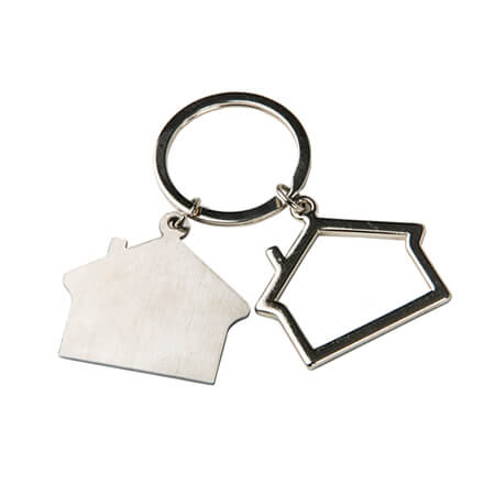 Llavero doble metálico en forma de casa, placa sólida y silueta, con arillo reforzado para colgar. Medidas: 3 alto x 3.8 ancho