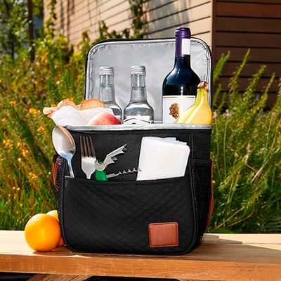Lonchera con interior plastificado, bolsa principal con cierre, 2 bolsillos laterales de red y bolsa frontal con diseño capitonado y con parche de curpiel. Para mayor comodidad cuenta con asa de transporte superior y correa ajustable para hombro. Capacidad para 9 latas. Medidas: 25 x 23.5 x 16 cm