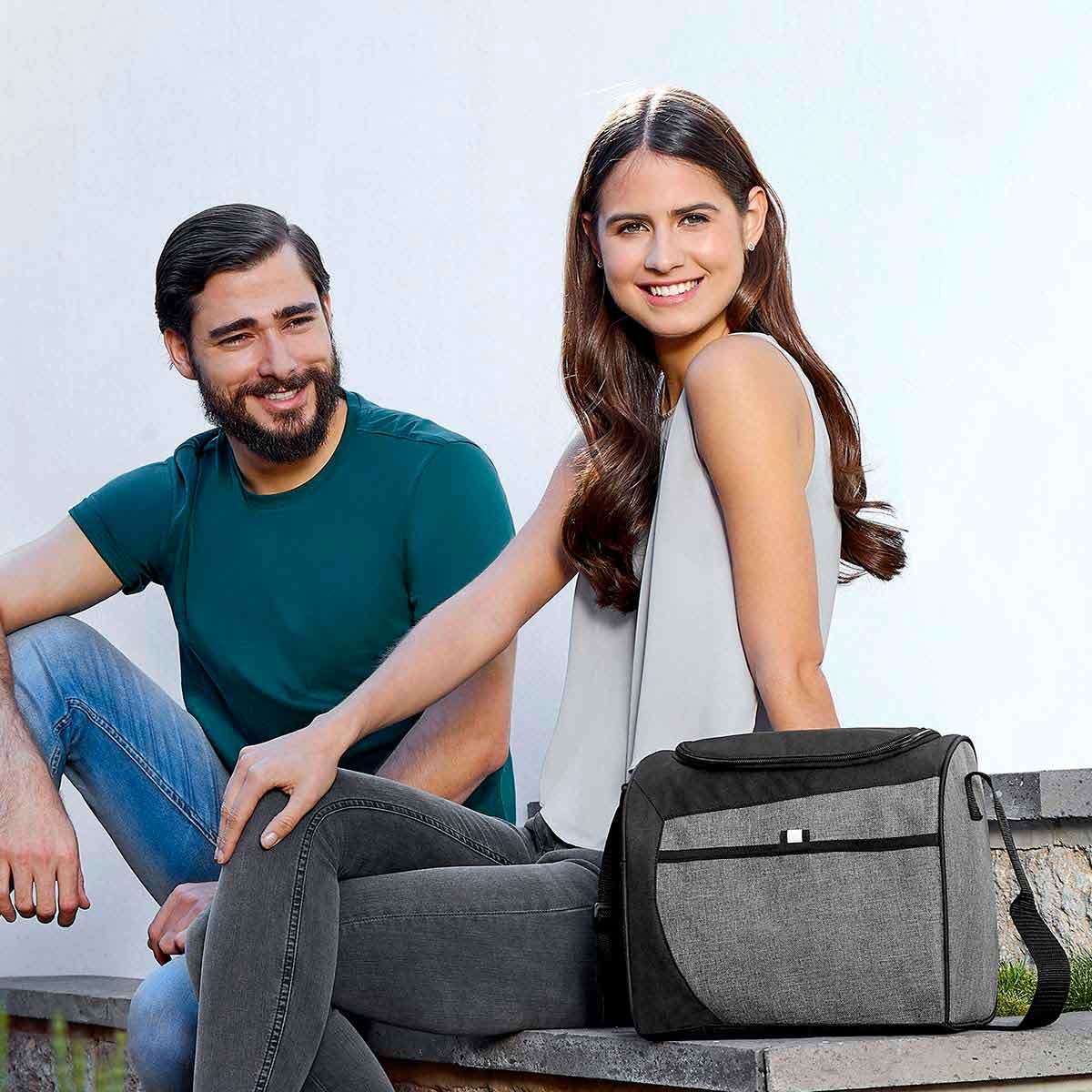Interior metalizado. Bolsa principal y frontal con cierre. Bolsa lateral de malla y correa ajustable. Capacidad para 16 latas. Medidas: 28.5 x 25 x 17.5 cm