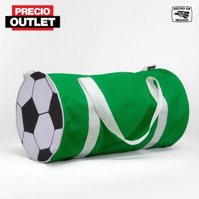 Maleta tricolor de poliéster, con laterales estampados en forma de balón. Correa ajustable y asas de sujeción.