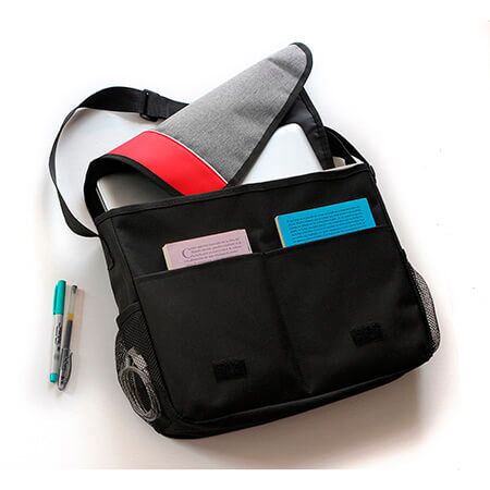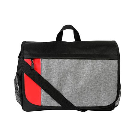 Maletín fabricado en poliéster con compartimento para laptop, bolsillo frontal con cierre, cuenta con 2 compartimientos, correa de hombro ajustable, asa en la parte superior y 2 bolsillos en los laterales de la bolsa. Medidas: 32x42 cm.