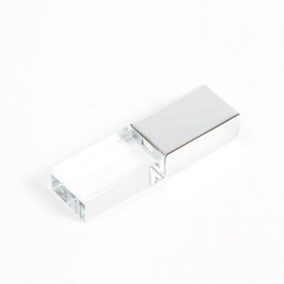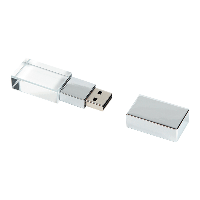 Memoria USB 16 GB de cristal cuadrada con tapa metálica y luz led color azul, en estuche metálico con ventana. Medidas: 1.9x5.7 cm.