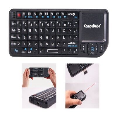 Mini teclado inalámbrico con touch pad y apuntador láser. Ideal para facilitar y controlar presentaciones y conferencias sin añadir demasiados equipos. Dispone de un rango de operación aproximado de 12 mts, no es necesario apuntar y/o estar cerca del dispositivo para su funcionamiento. Puede verse en la oscuridad, debido a que su teclado cuenta con luz de fondo LED. Producto de alta calidad que une la última tecnología a un mínimo tamaño y gran autonomía. Presentación: caja de regalo a color. Medidas: 15 x 6 x 1.25 cm