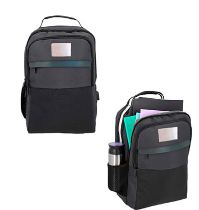 Mochila con compartimento principal, espacio para laptop de 17", dos compartimentos frontales, malla lateral, asa y banda reflejante. Medidas: 44 alto x 28 ancho