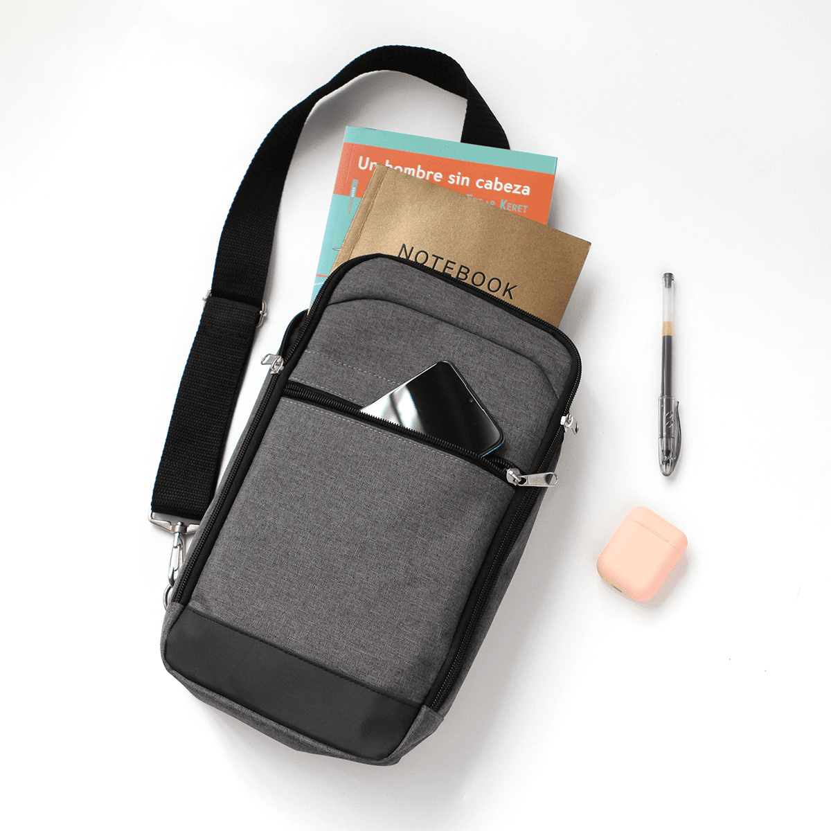 Mochila de hombro fabricada en poliéster, bolsa frontal con cierre y correa de hombro ajustable. Medidas: 31x16 cm.