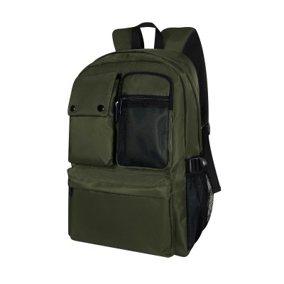 Mochila con amplia bolsa principal con compartimento interno para laptop de hasta 15" y dos bolsas internas. Cuenta con 3 bolsillos frontales, dos de ellos con cierre y uno con sistema de botones. Tiene un par de ajustadores expandibles y laterales de malla. Medidas: 32 x 45 x 15 cm