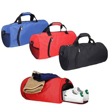 Maleta deportiva con zapatera y dos compartimientos exteriores, red lateral, asas y correa ajustable. Medidas: 26 alto x 48 ancho