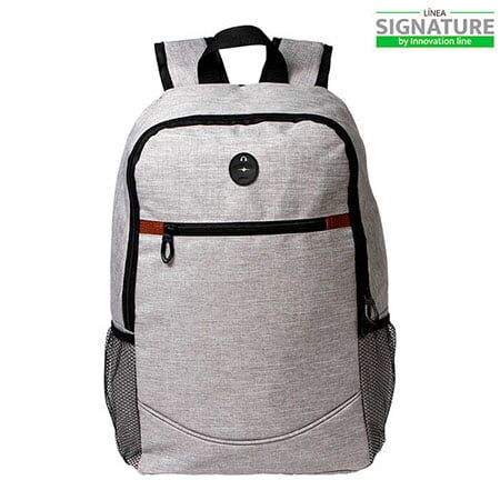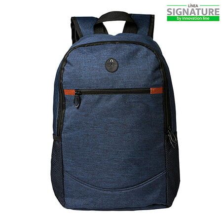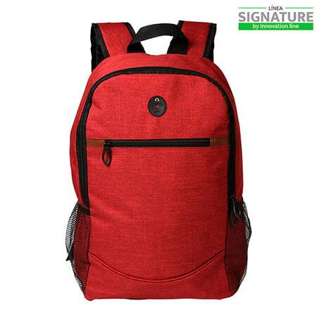 Mochila Signature tipo backpack con salida para audífonos y 2 compartimentos laterales de malla, fabricada en poliéster de alta calidad y bolsa al frente con cierre. Medidas: 44x27 cm.
