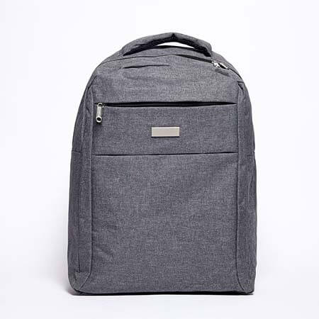 Mochila de poliéster 600D con cierres de alta resistencia y compartimiento acolchado para laptop de 15 pulgadas y bolsillo frontal. Asas acolchadas y ajustables. Incluye placa metálica.
