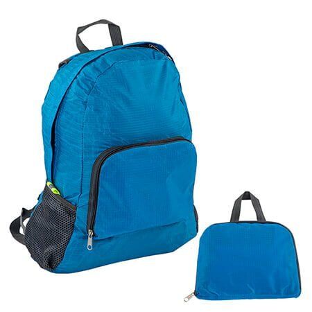 Mochila de 2 compartimentos con cierre y bolsillos laterales de red. Esta mochila se dobla y se convierte en una práctica bolsa para llevar. Medidas: 48 alto x 31 ancho