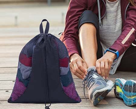 Morral con diseño lateral de red que permite un secado rápido para ropa húmeda, cuenta con jaretas ajustables para colgarse y asa superior. Compartimento trasero plastificado para colocar credenciales. Medidas: 38 x 45.7 cm
