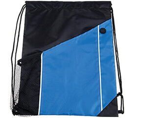 Backpack con jareta, compartimento exterior, orificio para cable de audífonos y bolsa lateral de malla. Medidas: 33 x 44.5 cm