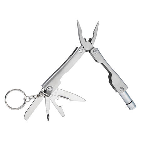 Mini herramienta con 7 funciones, contiene: lámpara de 1 LED, navaja, desarmador de cruz, serrucho, destapador con punta de desarmador plano. Incluye funda y 3 baterías. Medidas: 5.7 alto x 11 ancho