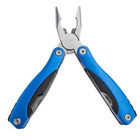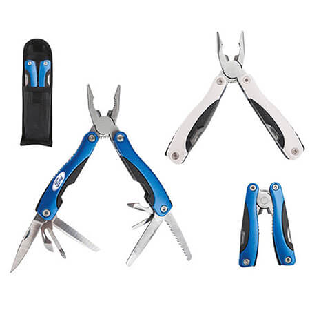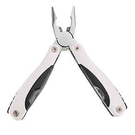 Herramienta plegable con 9 funciones: lima, abre latas, doble destapador, sierra, desarmador de cruz, dos desarmadores planos, navaja, pinzas y seguro de bloqueo. Incluye funda. Medidas: 16 alto x 13.5 ancho