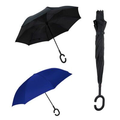 Paraguas reversible manual de 8 gajos dobles y mango de plástico con sujeta bolsas. Medidas: 79.5 alto x 123.7 ancho