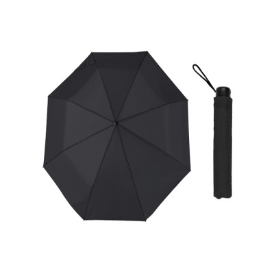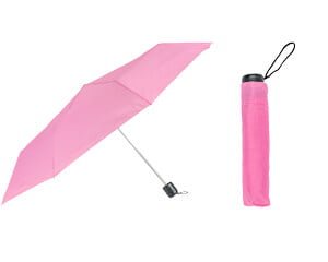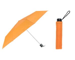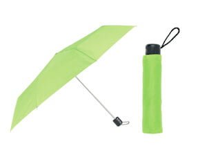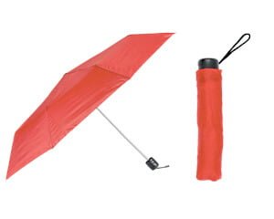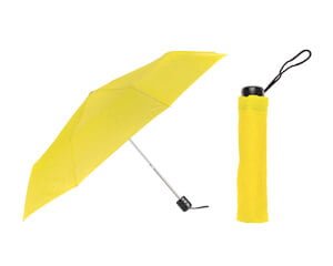 Paraguas de bolsillo de 8 gajos con apertura manual y botón de cierre, varillas y eje de metal, mango de plástico y correa de cordón. Incluye funda. Medidas: Abierto: Ø 100 x 57 cm / Cerrado: 24 cm