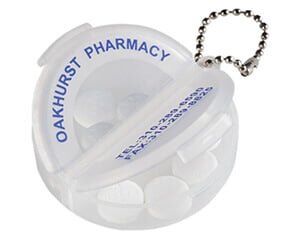 Pastillero de plástico traslúcido, con doble tapa y dos divisiones, para control de dosis médica. Medidas: Ø 6 x 1.8 cm
