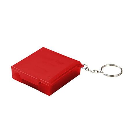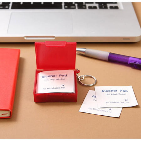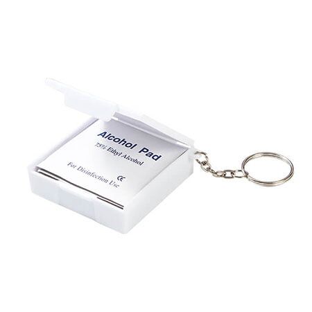 Llavero contenedor fabricado en plástico PP, con 10 pads de non woven, con alcohol al 75%. Medidas: 5x5.8 cm.