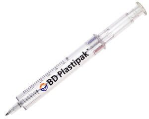 Bolígrafo en forma de jeringa con cuerpo traslúcido. Mecanismo de click. Medidas: 13.1 x 1.3 cm