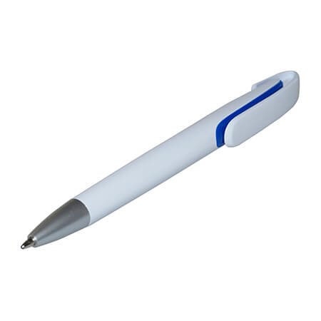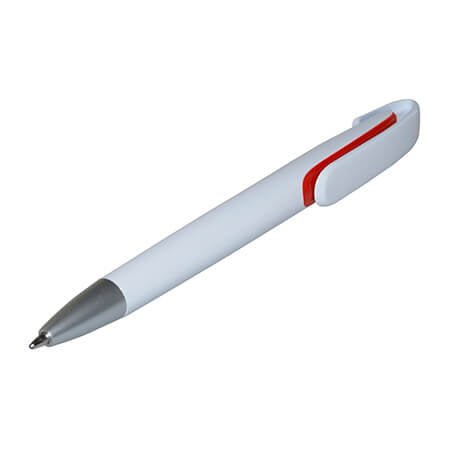 Bolígrafo blanco con detalles en color, tinta negra, sistema push. Amplia área de impresión en el clip.