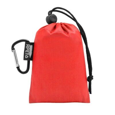 127 x 100 cm. Polietileno. Poncho impermeable. Presentación en bolsa de RPET de diferentes colores con cierre ajustable y mosquetón de aluminio color negro.