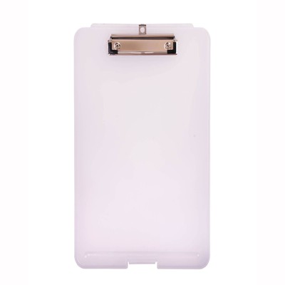 Porta documentos de plástico traslúcido con clip exterior metálico para sujetar hojas. Medidas: 24.5 x 34.5 x 2.2 cm